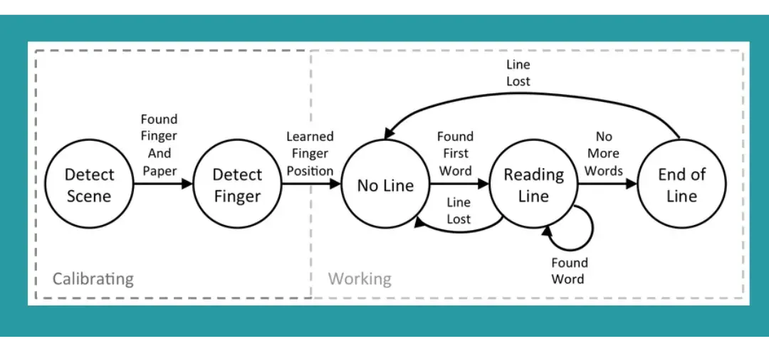 L’algoritmo di lettura, il vero punto forte, è composto da vari sotto-algoritmi. Quest’ultimi, in primis, hanno lo scopo di rilevare la scena (scritta), il dito (puntatore) e poi di gestire la riga di lettura (assente, presente, finita).