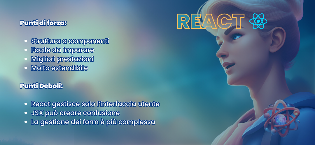 Con React si ha più libertà in un certo senso, perché essendo una libreria il developer non deve necessariamente seguire “degli schemi di sviluppo”; anche se in realtà sarebbe opportuno farlo.