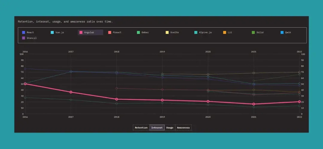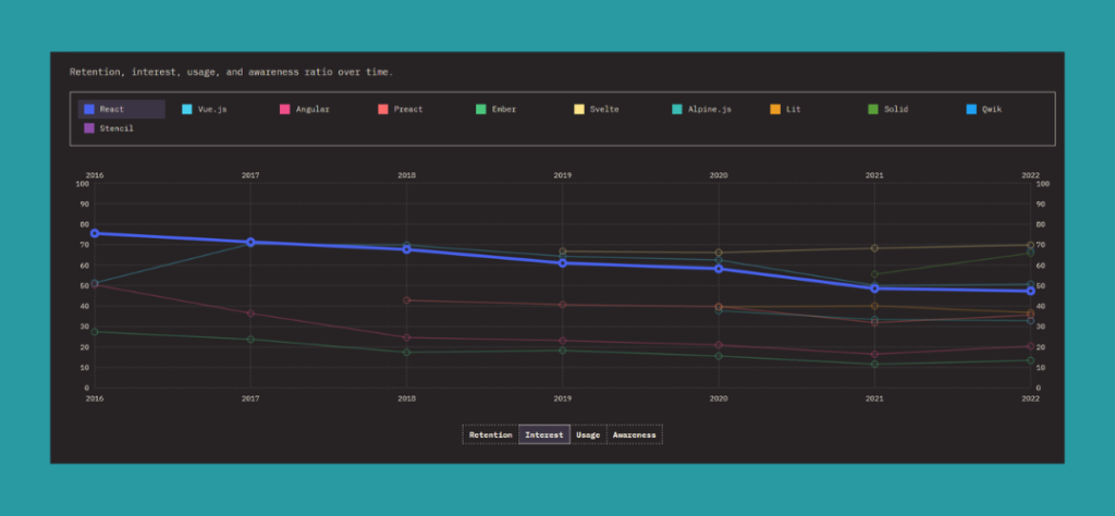 Il dato più significativo è sicuramente l’interesse verso Angular, che dal 2016 al 2022 ha subito una perdita di interesse del 26%, passando da 68% a 43% degli intervistati.
