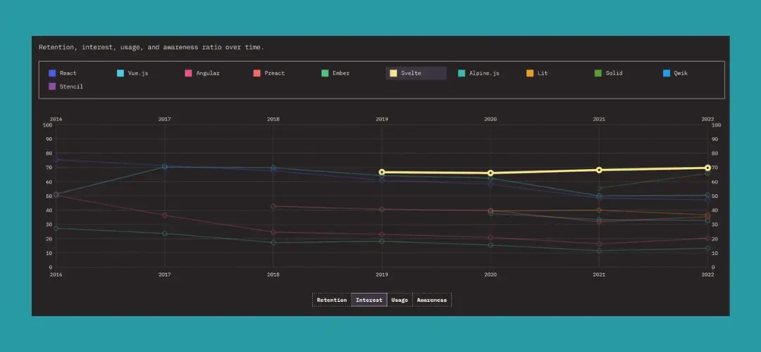 Svelte invece, da quando è stato lanciato (2019) ha visto crescere (seppur di poco) le percentuali di interesse, passando dall’87% all’89% di persone che l’hanno usato e vorrebbero riusarlo e dal 66% al 70% di persone che vorrebbero impararlo.